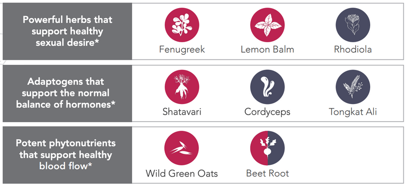 • Clinically validated adaptogens, herbs, and phytonutrients to support sexual wellness.*