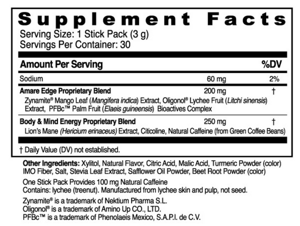 Edge (powder):The all-natural nootropic that supports mood, motivation and metabolism through Mango Leaf, Lychee Fruit, Palm Fruit.