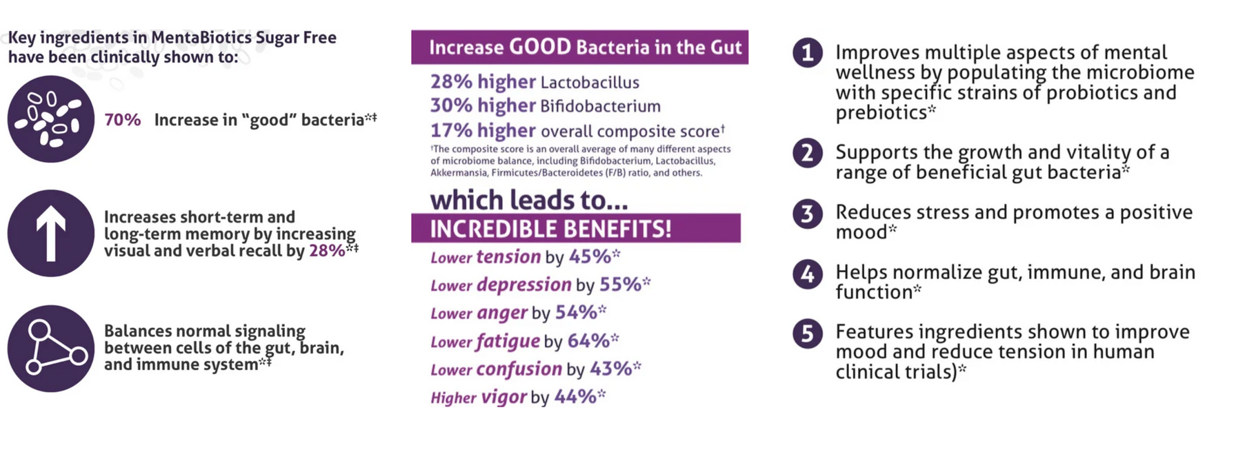 MentaBiotics supports the growth and vitality of a range of friendly gut bacteria to increase the production of the “feel-good neurotransmitters. In fact, 90% of our serotonin, the primary neurotransmitter responsible for happiness and mood, is actually produced and located in our gut.