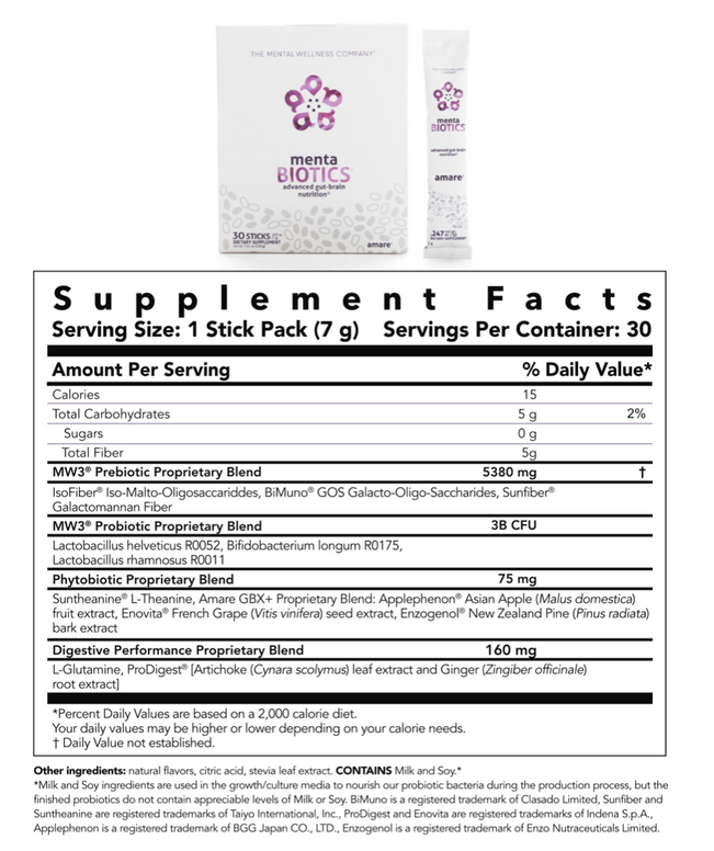 The most comprehensive combination of unique strains of probiotics, prebiotics, and phytobiotics that have been scientifically shown to improve mental wellness.